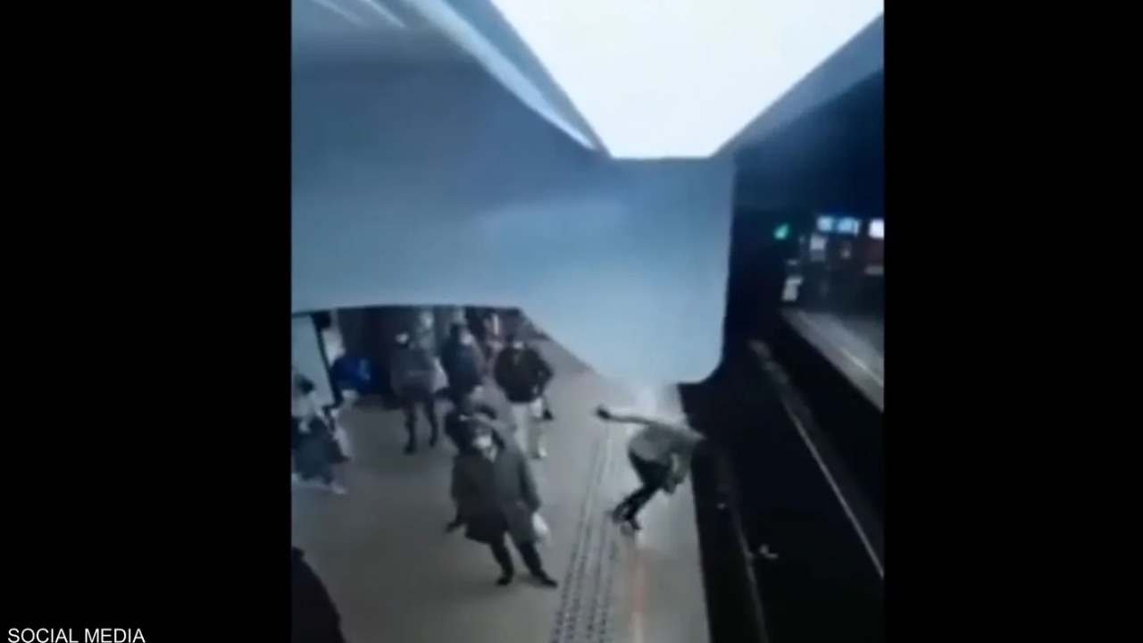 ووسط دهشة المتواجدين في المكان، يدفع الشاب السيدة نحو شريط المترو، لكن لحسن حظها توقف القطار قبل الاصطدام بها بمسافة قصيرة جدا.